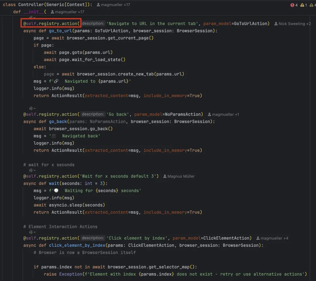 - controller:整个框架的动作执行引擎&Action注册管理,负责将 AI Agent 的决策转换为具体的浏览器操作;