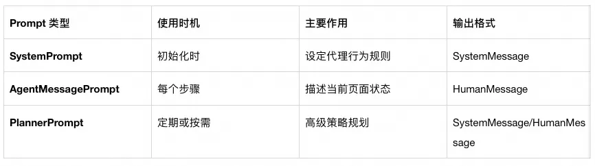 BrowserUse 中的 Prompt 主要分为了三种类型:
