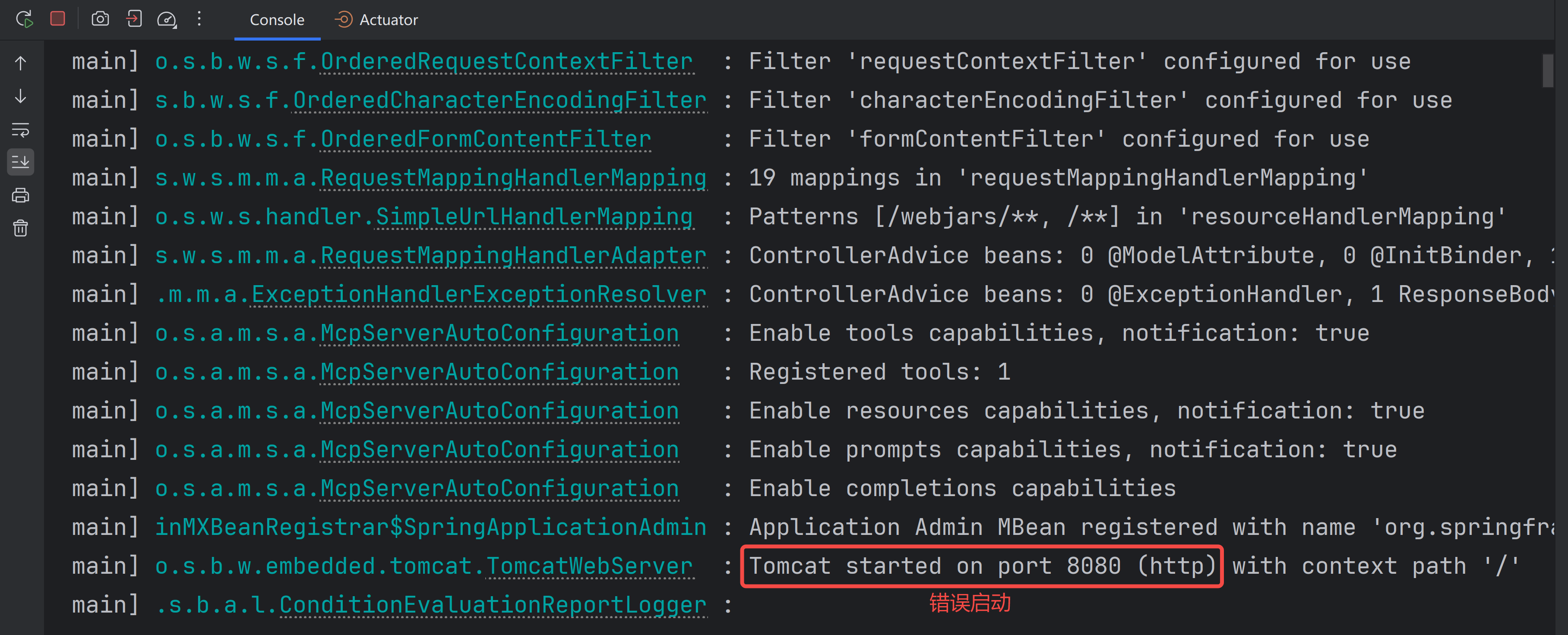 也就是说,你的 spring-ai-starter-mcp-server-webflux 依赖不能和 spring-boot-starter-web 依赖并存,以下是错误配置: