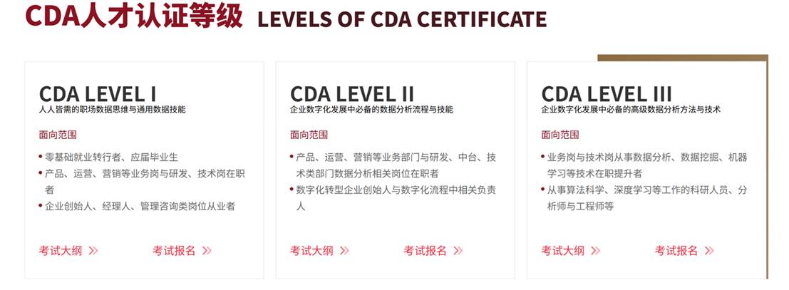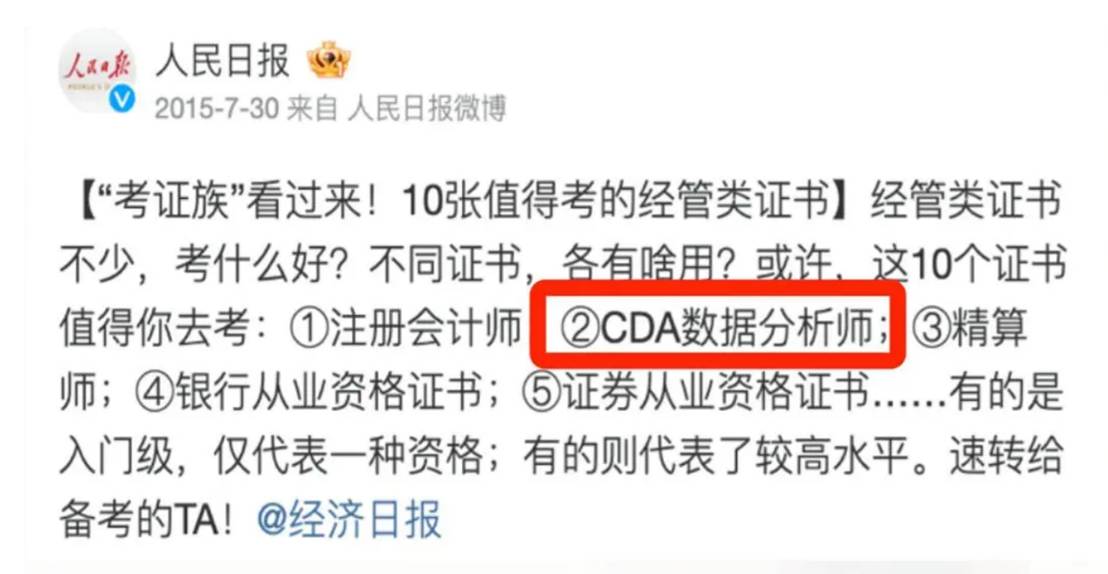 - 数据领域认可度最高的证书,与CPA注会、CFA特许金融师齐名,受到人民日报、经济日报等权威媒体推荐
