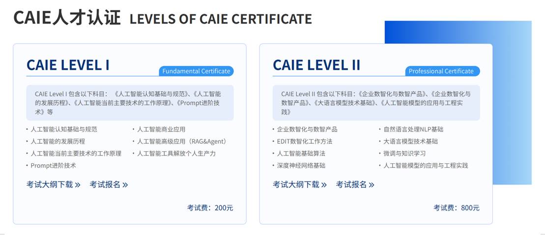 选择适合自己的认证路径,系统学习并付诸实践,您将在职场竞争中把握先机,实现薪资与职级的双重跃升!:面向AI初学者,涵盖人工智能基础、Prompt技术、商业应用等核心内容,官方赠送教材资料、配套视频,零基础自学备考在2周-1个月也可拿下。:分为计算机视觉和自然语言处理两个方向,深入算法开发与系统设计,适合希望在AI领域深耕的专业人士,需备考2-4个月通过考试。数据领域认可度最高的证书,与CPA注会、