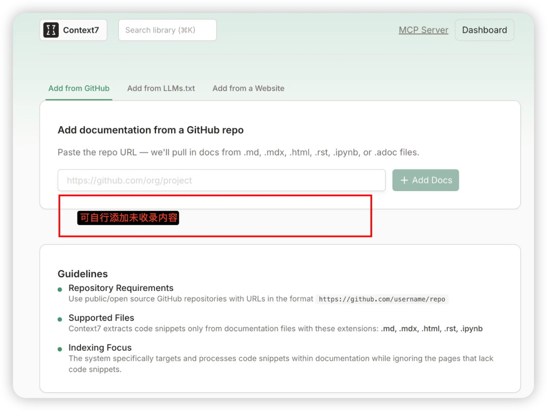 https://github.com/username/repo),官网会自动从仓库的.md、.mdx、.ipynb 等文件中提取代码片段,构建索引。
