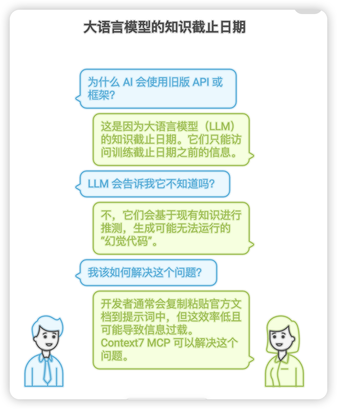 更麻烦的是, LLM 不会主动告知 “我不懂”,而是会基于已有知识进行 “合理推测”,最终生成无法运行的 “幻觉代码”。为了补救,很多开发者会手动复制粘贴官方文档到提示词中,但几十页的文档来回搬运不仅效率低,还可能因为信息过载导致 AI 无法精准使用关键内容 —— 此时,Context7 MCP 的出现恰好解决了这一困境。