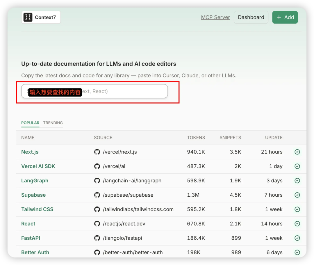 库文档检索:在顶部搜索框输入库名(如 “Next.js”“FastAPI”),即可找到对应库的最新文档,支持按 “更新时间”“代码片段数量” 筛选;
