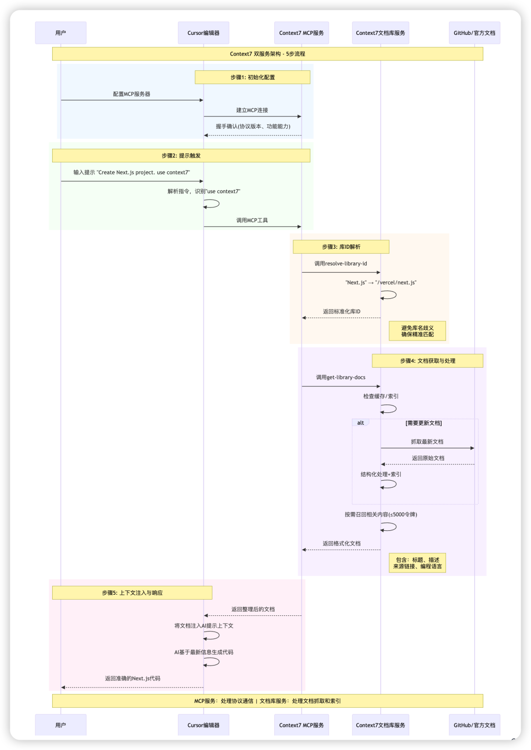 Context7 基于 MCP 协议的 "客户端 - 服务器" 架构工作,整个流程可拆解为 5 个关键步骤,确保最新文档能精准注入 AI 上下文: