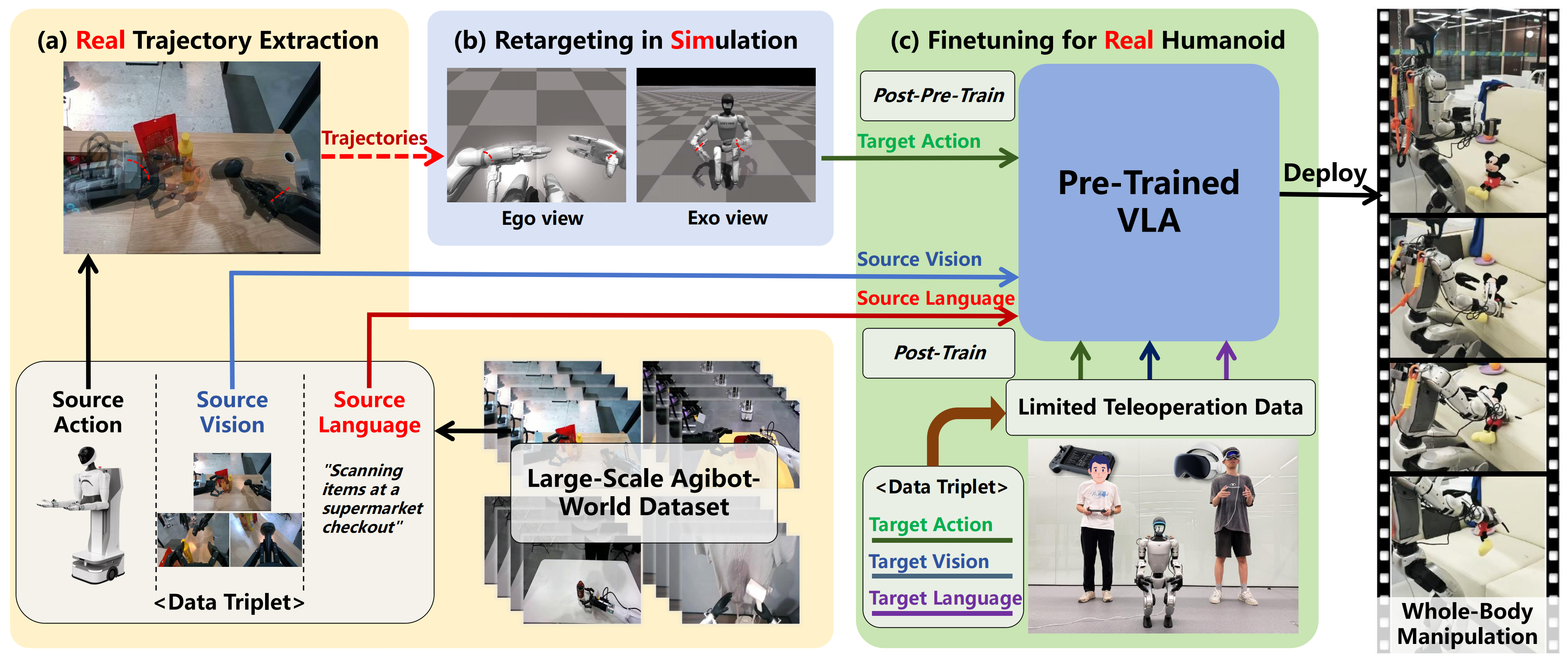 他们的关键见解在于,尽管形态结构存在差异,末端执行器轨迹可以作为共享接口,弥合不同实体之间的关节空间差距。从而可以通过利用轮式人形机器人Agibot G1的大规模数据,通过真实-仿真-真实的流程,间接提升了对双足Unitree G1的VLA训练