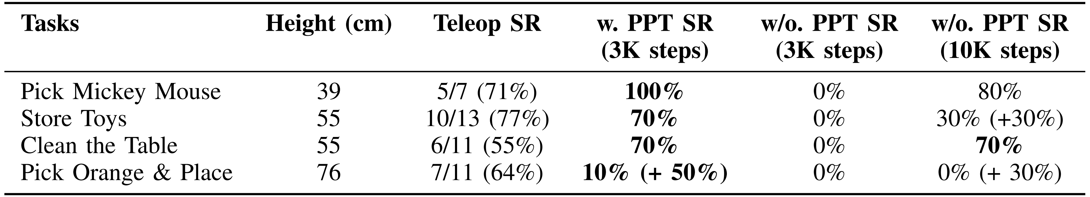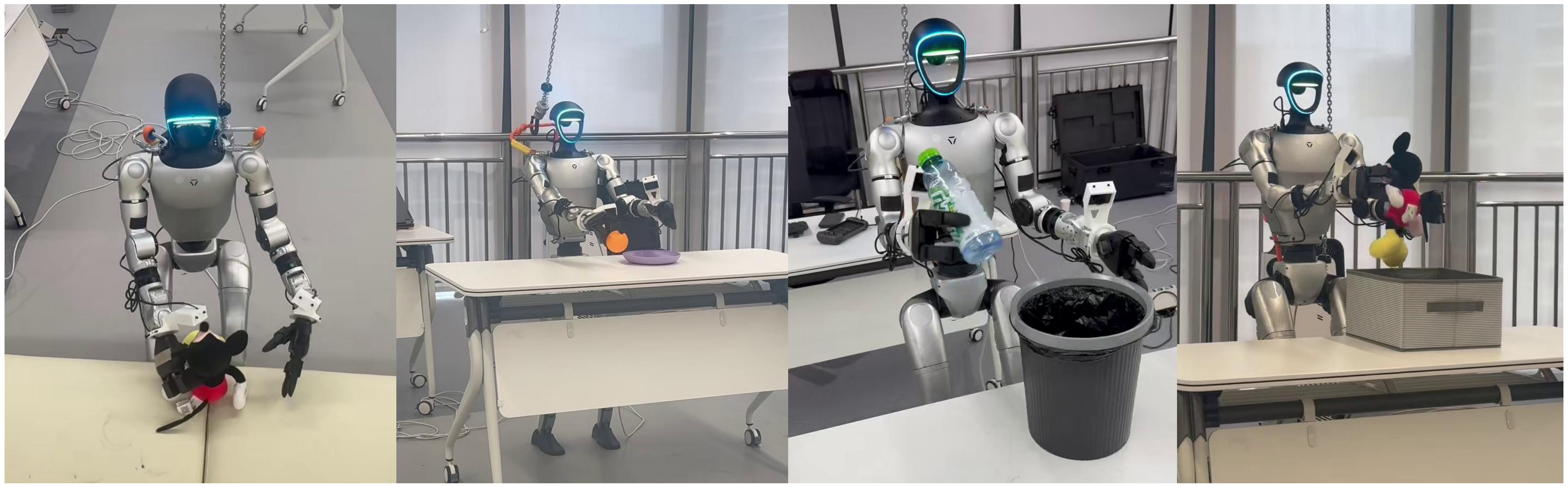 接着,仅需额外10分钟的真实遥操作数据,即⟨target vision,target language, target action⟩,即可对后预训练的 VLA 进行微调,并部署在 Unitree G1 上,覆盖广泛的全身操作任务