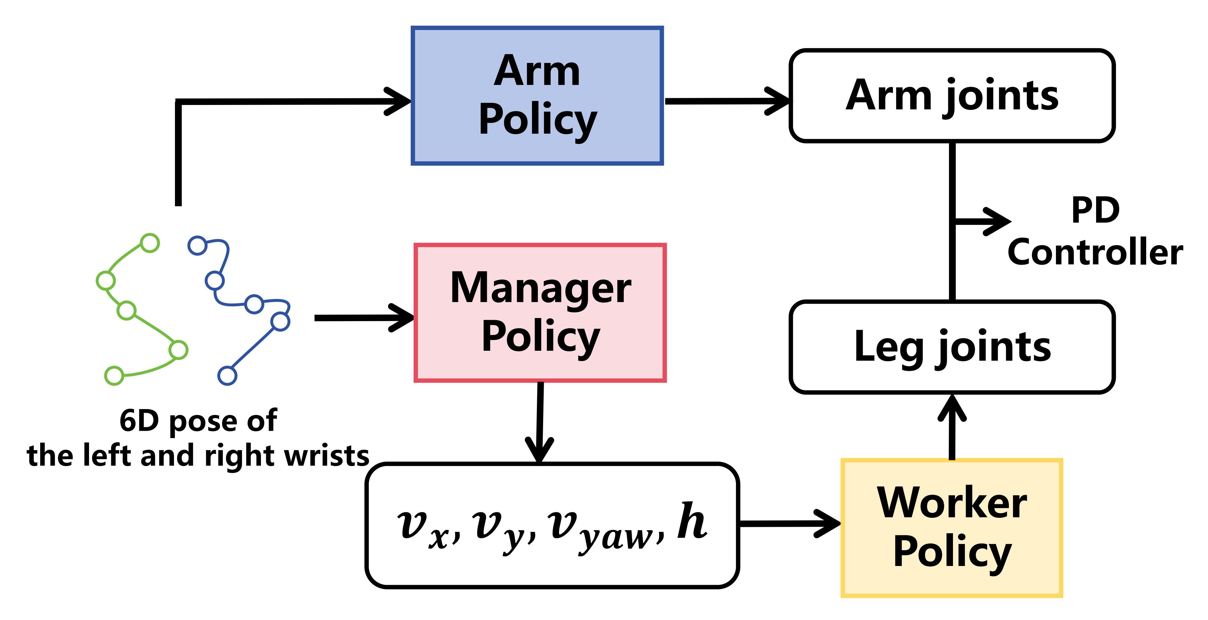这种设定未能充分利用人形机器人下肢的运动能力,从而限制了机器人的操作空间 - 尽管 Homie[17] 通过其视觉运动控制策略在解决这一限制方面取得了显著进展,但其实用性仍受限于需要为每个任务单独训练策略,因此在多样化任务场景中的可扩展性有限