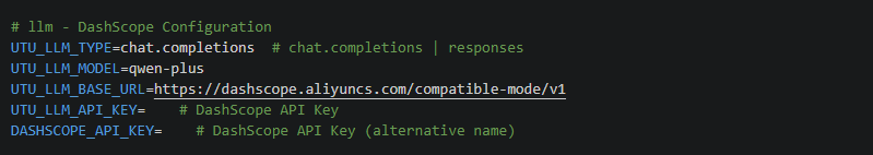 # DashScope API 配置 (推荐中国用户使用) DASHSCOPE_API_KEY=your_dashscope_api_key_here LLM_MODEL_NAME=qwen-flash LLM_BASE_URL=https://dashscope.aliyuncs.com/compatible-mode/v1 # 禁用可能的网络问题组件 PHOENIX_ENDPOINT= OTEL_SDK_DISABLED=true OPENAI_AGENTS_TRACES_ENABLED=false