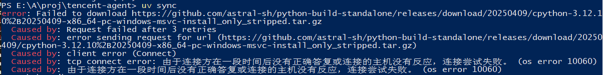 您遇到的错误是因为 uv 工具试图从 GitHub 下载一个 Python 发行版(cpython-3.12.10+20250409-x86_64-pc-windows-msvc-install_only_stripped.tar.gz),但是由于网络连接问题,连接超时失败了。错误信息显示:"由于连接方在一段时间后没有正确答复或连接的主机没有反应,连接尝试失败"。