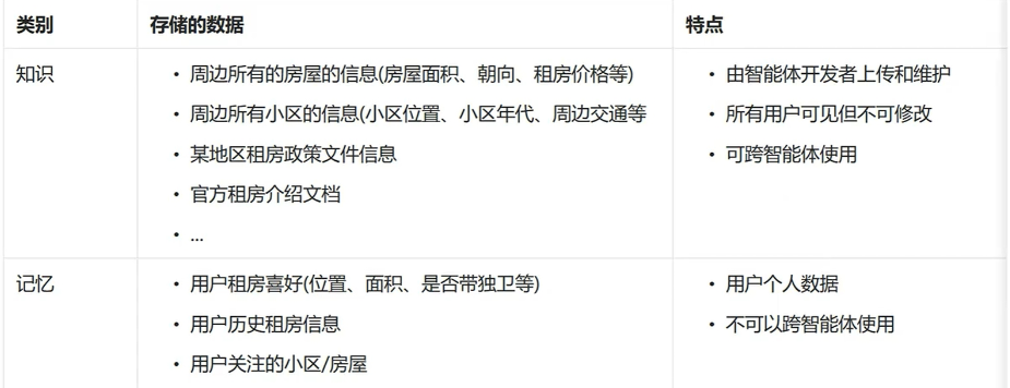 以一个租房平台的智能体为例,下表展示了哪些数据是需要通过如识功能来维护的,哪些数据是通过记忆功能来维护的。