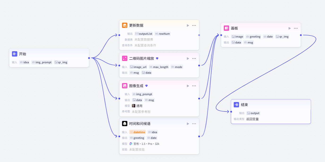 扣子提供了一个可视化画布,你可以通过拖拽节点迅速搭建工作流。同时,支持在画布实时调试工作流。在工作流画布中,你可以清晰地看到数据的流转过程和任务的执行顺序。