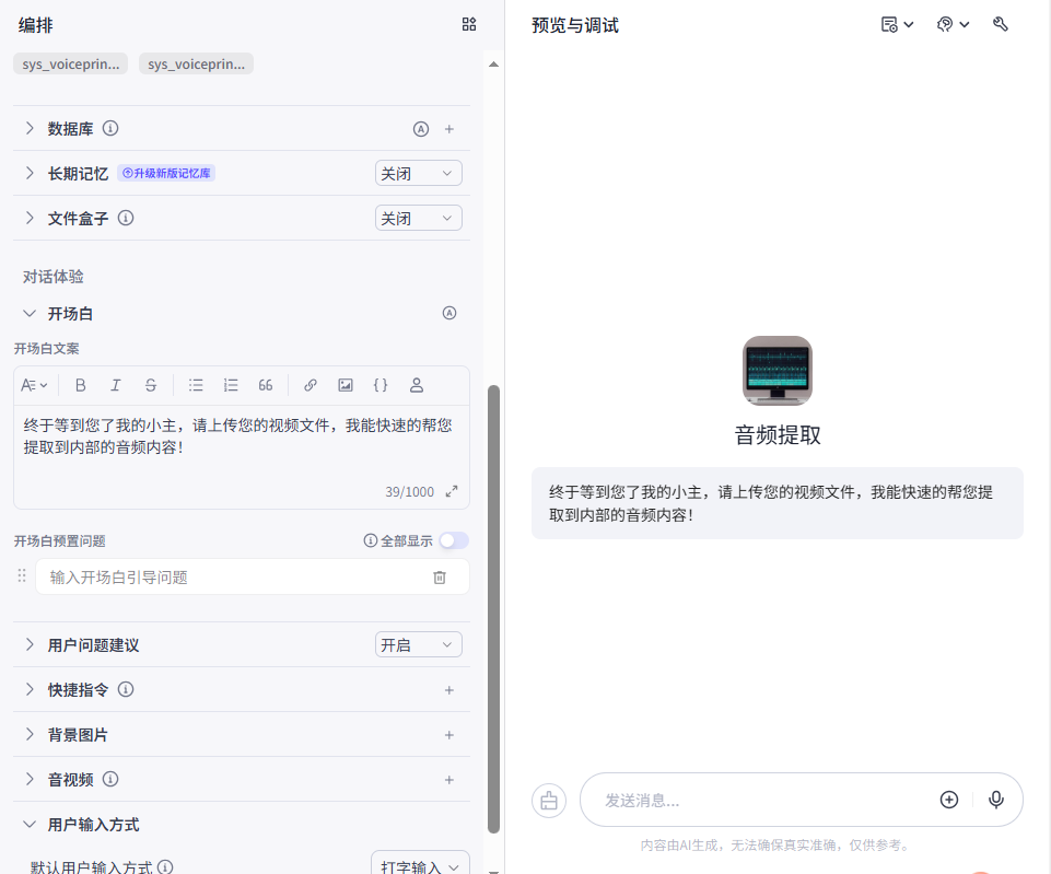 点击“确认”,直接进入智能体信息编排页面了,可以针对性就行修改。