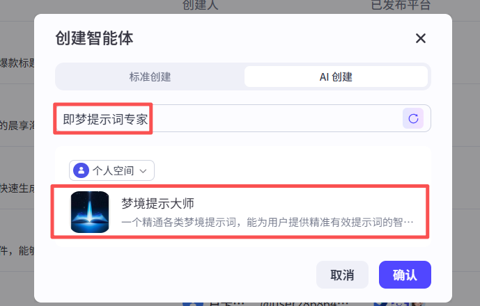 AI创建就是 “用一句话创建智能体”,我们这里主要说的是标准创建;