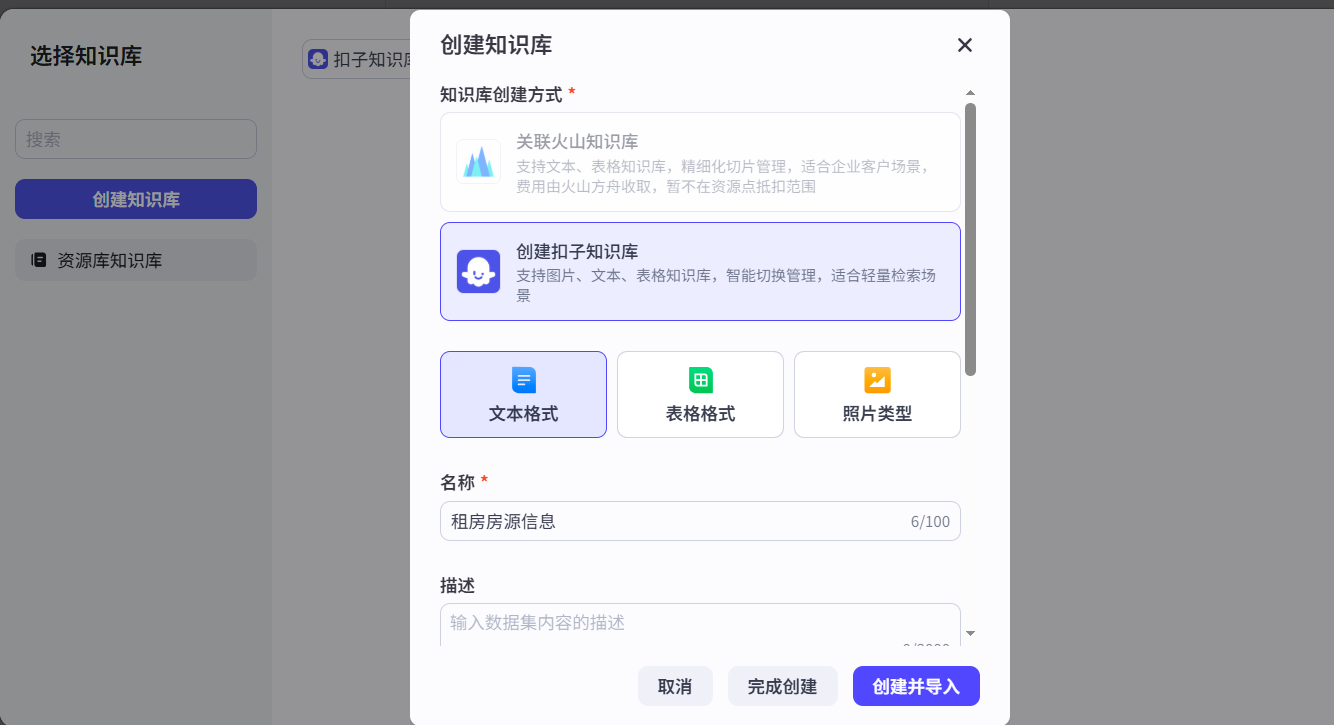 创建知识库主要是为了给智能体投喂一下数据,后续智能体可以直接通过知识库内获取信息
