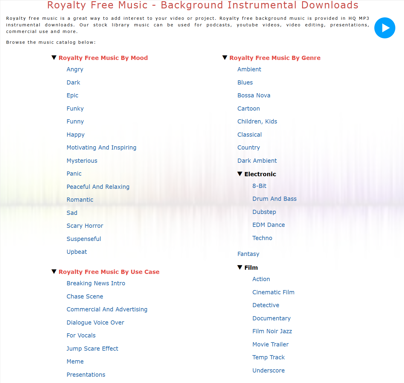 一个专业的音效素材网站,拥有超过 70 万首免版税音效素材(Royalty Free Music),你可以在你的视频或项目中免费下载使用,而不用担心版权问题。网站的音效素材涵盖了各种情绪、主题、影视、游戏等分类,还有一些专为商业项目打造的音乐素材,非常实用。这样一个值得收藏的音效素材网站,可以为你的视频增添色彩和氛围哦。