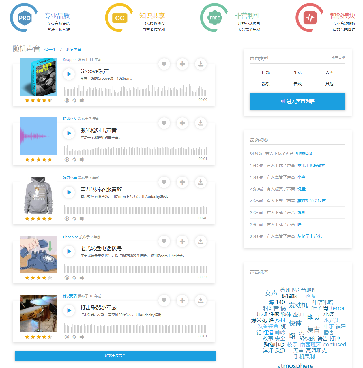 良心网站,非营利性,站内有非常多的音效、配乐素材。网站入驻了专业的录音师,所有音频素材都是CC授权,可以免费下载使用,甚至可用于商业性目的,但在使用时必须明确提及音频的原作者。