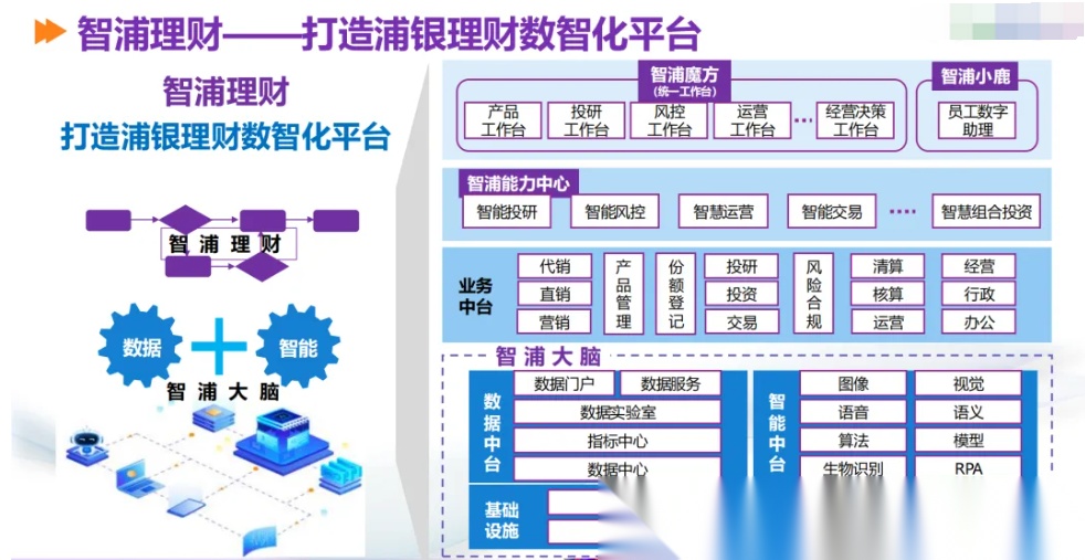 2、数字化 2.0(数智化):构建 “智浦大脑”,整合数据中台与智能中台,引入 AI、RPA、知识图谱等技术,实现从 “线上化” 到 “智能化” 的跨越,为 “浦小鹿” 提供数据与技术支撑;