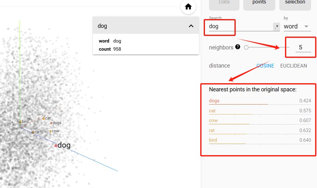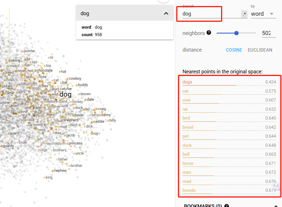 例如:我搜索dog,就能根据dog关键词的向量,找到语义相近的所有词,并根据相似度高低进行排序展示。注意:这个相似度距离是可设置的。