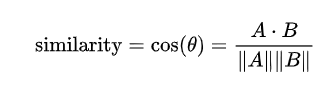 通过计算两个向量的夹角余弦值来评估他们的相似度。两个向量夹角的余弦值范围[-1,1],数值越大表示越相似。给定两个属性向量,A和B,其余弦相似性θ由点积和向量长度给出,如下所示: