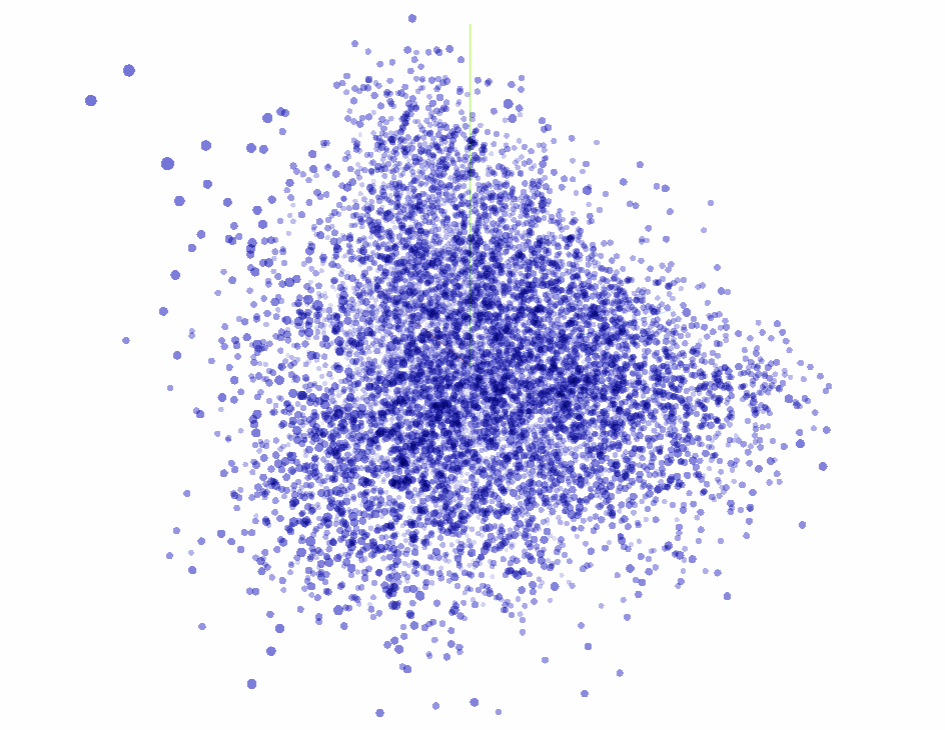 下面是谷歌开源的向量(Embedding)可视化工具,把词条或图片等数据文件,通过不同的降维技术(如PCA、t-SNE等)将高维数据投影到二维或三维空间中,进行直观地展示。这是我加载的词向量模型,每个蓝点是一个英文单词的向量点。