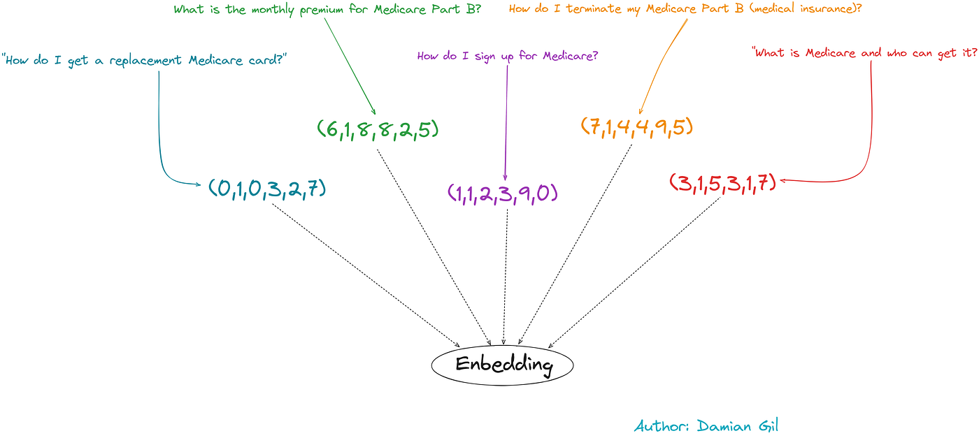 LLM 无法直接理解书面文本,我们需要转换这类模型的输入。为此,需要进行句子嵌入。它包括将文本转换为数值向量。下图可以阐明这个概念: