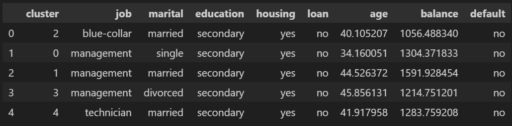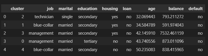 发生了一件非常奇怪的事情:最常见职位是“management”的聚类有 3 个。在这些聚类中,我们发现一种非常特殊的行为,即单身经理更年轻,已婚经理更年长,而离婚经理最年长。另一方面,余额表现不同,单身人士的平均余额高于离婚人士,已婚人士的平均余额更高。所说的内容可以总结在下图中: