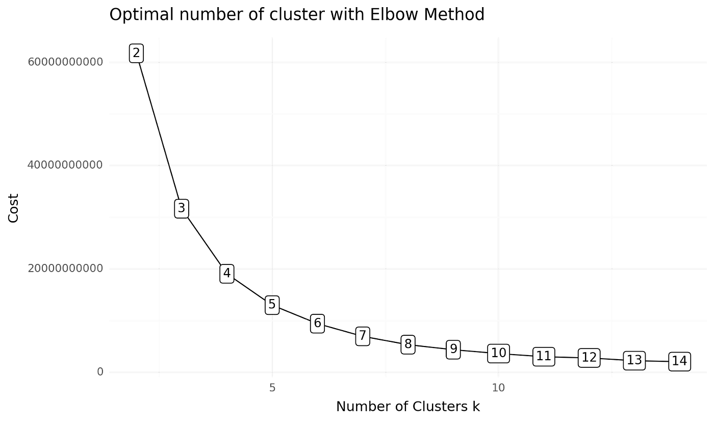 首先我们必须找出最佳聚类数量。为此,我们使用肘部法则。