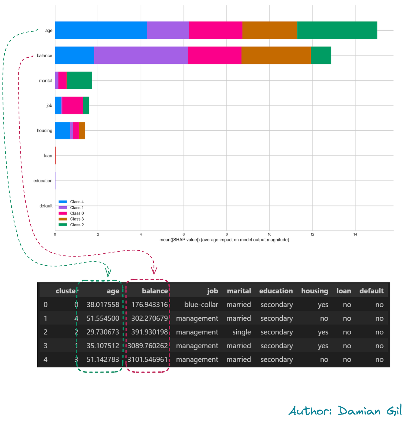 模型中变量的重要性。表格表示每个聚类中最频繁的值(图片来源:作者)。