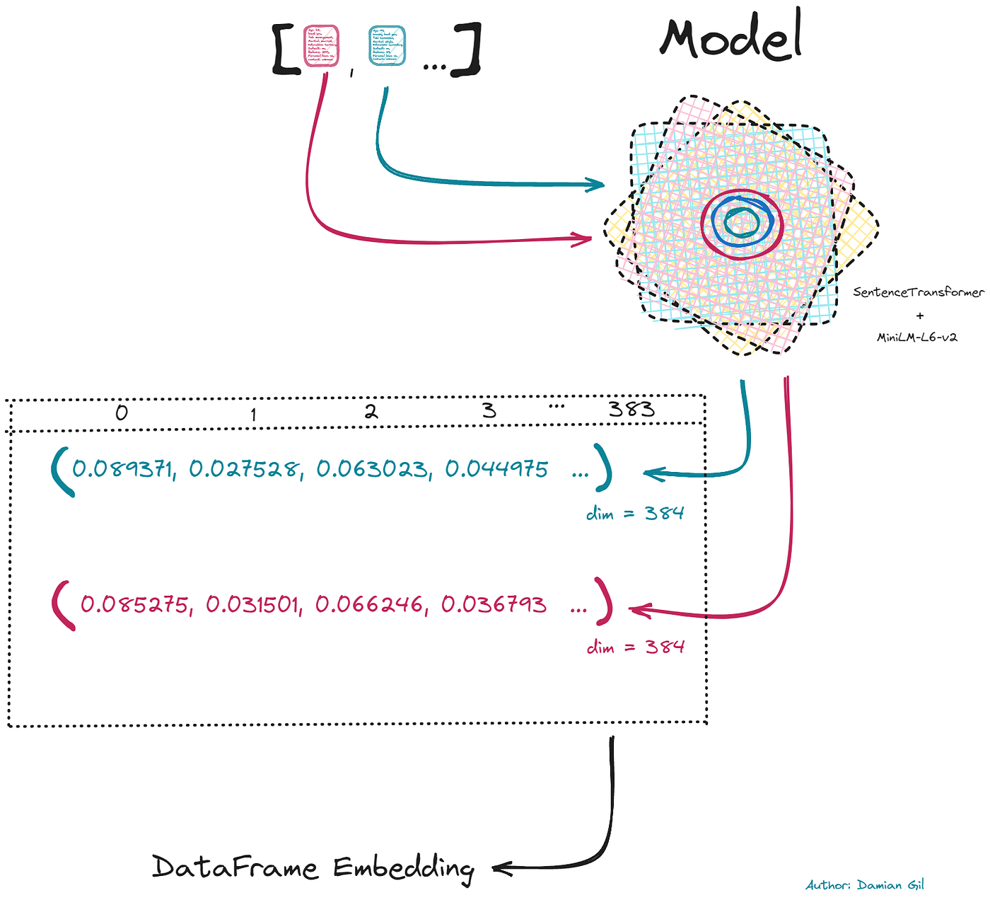 - 步骤 2:这是调用转换器的时候。为此,我们将使用存储在 HuggingFace 中的模型。该模型经过专门训练,可以在句子级别执行嵌入,与专注于标记和单词级别编码的 Bert 模型不同。要调用模型,您只需提供仓库地址,在本例中为 “sentence-transformers/paraphrase-MiniLM-L6-v2”。返回给我们的每个文本的数值向量将被归一化,因为 Kmeans 模型对输入的尺度敏感。创建的向量长度为 384。我们用它们创建一个具有相同列数的数据框。请看下图: