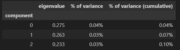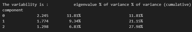 我们看到,3 个成分的累积变异性为 40.44%,这是可以接受的,但并非理想。