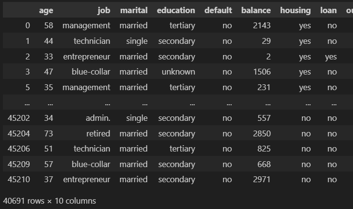 - job : 工作类型 (类别型: “admin.” ,”unknown”,”unemployed”, ”management”, ”housemaid”, ”entrepreneur”, ”student”, “blue-collar”, ”self-employed”, ”retired”, ”technician”, ”services”)