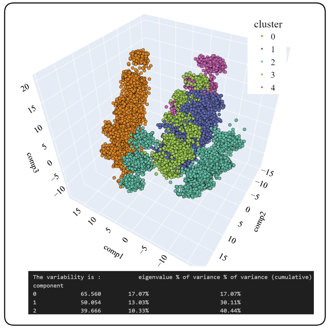 可以看出,聚类比传统方法更好地分化。这是个好消息。我们必须记住,考虑 PCA 分析前 3 个成分中包含的变异性很重要。根据经验,当它在 50% 左右(3D PCA)时,可以得出或多或少明确的结论。