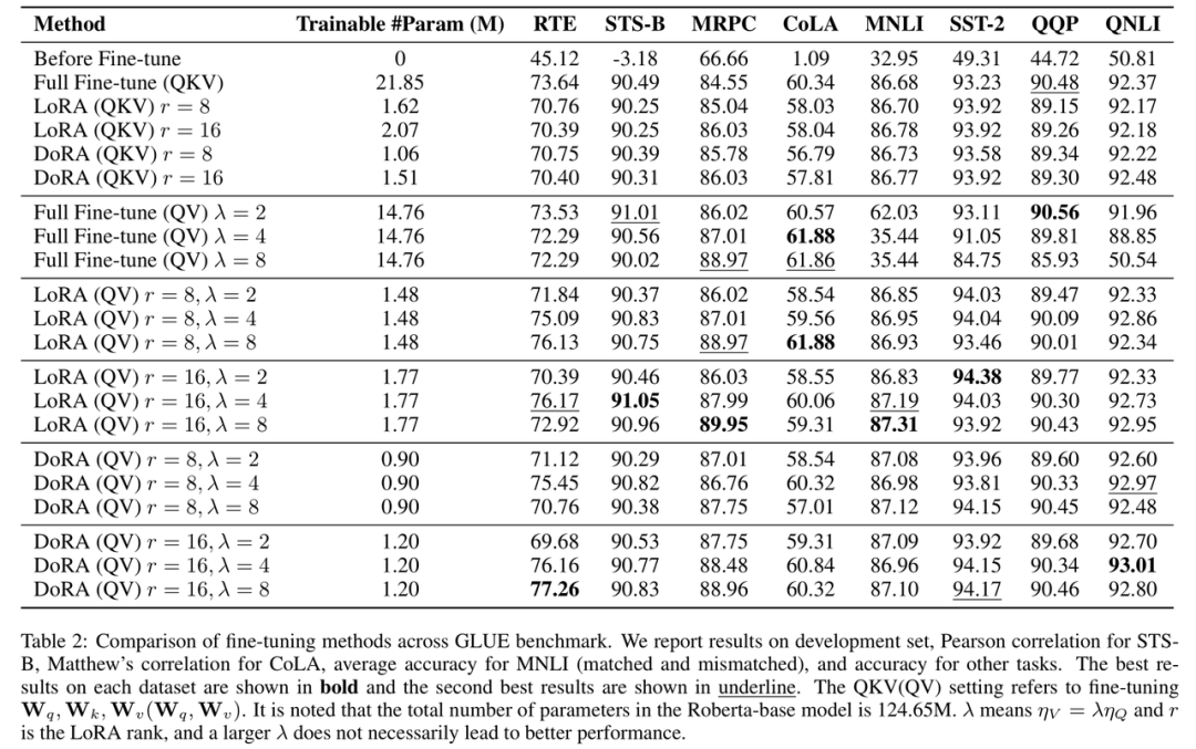 我们在全量微调,LoRA 和 DoRA [3] 等方法上验证了理论分析对微调算法改进的指导意义: