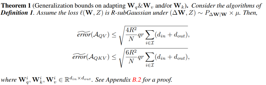 (1)在(泛化误差,内存友好性)方面,我们提出定理 1(信息论泛化界),证明在相同秩值(r)条件下,仅微调