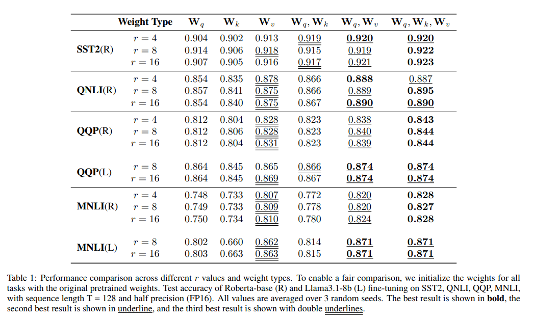 三者之间的交互作用。高效微调需要谨慎选择超参数,这包括如何选择适合微调的权重类型以及优化学习率设置等方面。尽管一些经验性准则(如 LoRA 原文)探索了相同参数量下微调不同权重矩阵的表现,但相关理论分析仍然有限。