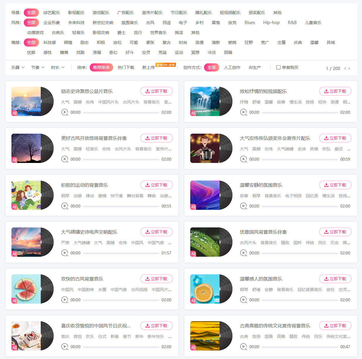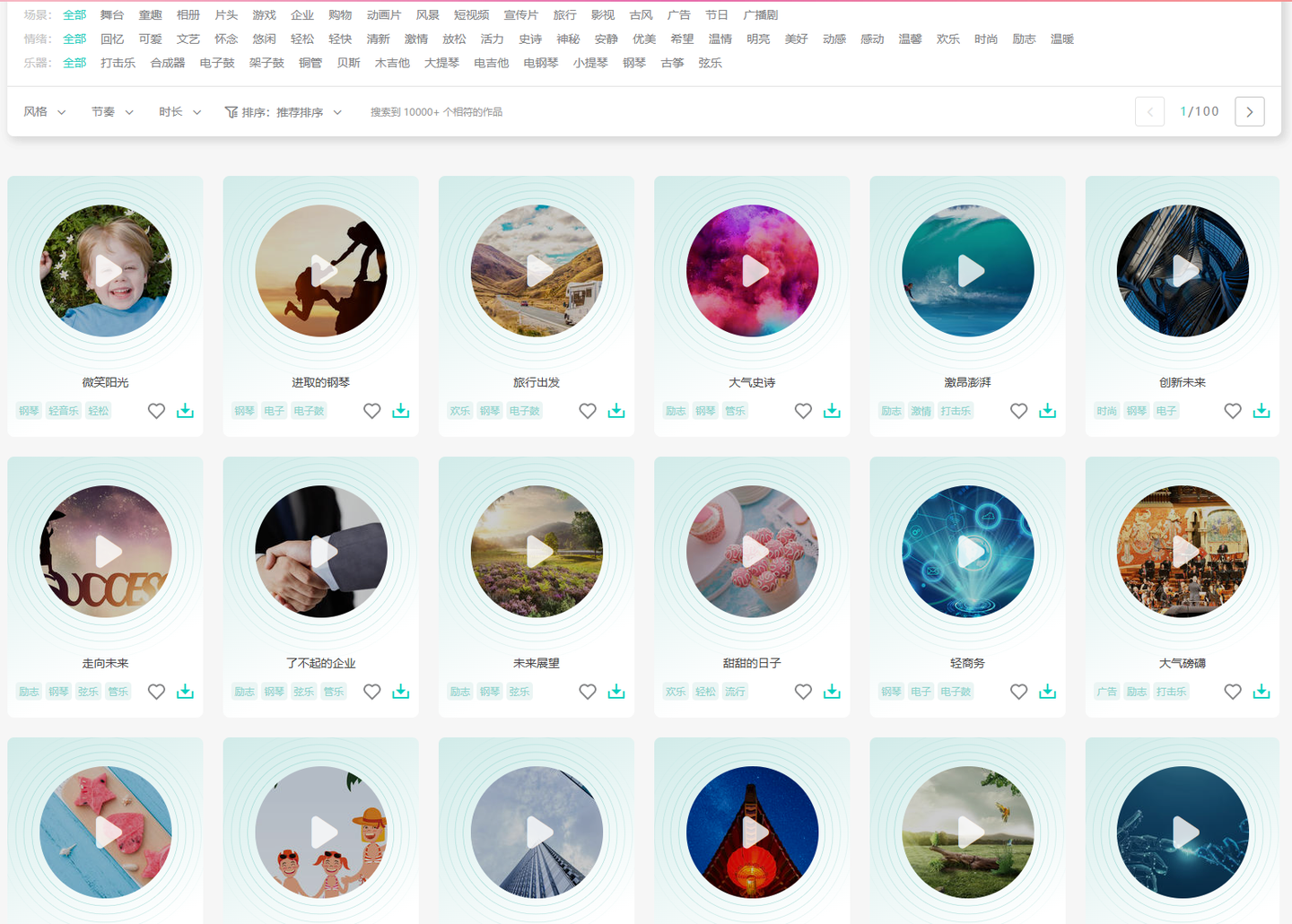 一个专门分享高质量视频的网站,站内还有非常丰富的配乐素材,全部都有详细的分类,可以选择适合自己使用场景的配乐素材,比如风格、乐器、节奏等等,还可以选择时长范围,查找非常方便。用户只需注册就能每天免费下载1次,赶紧用起来。