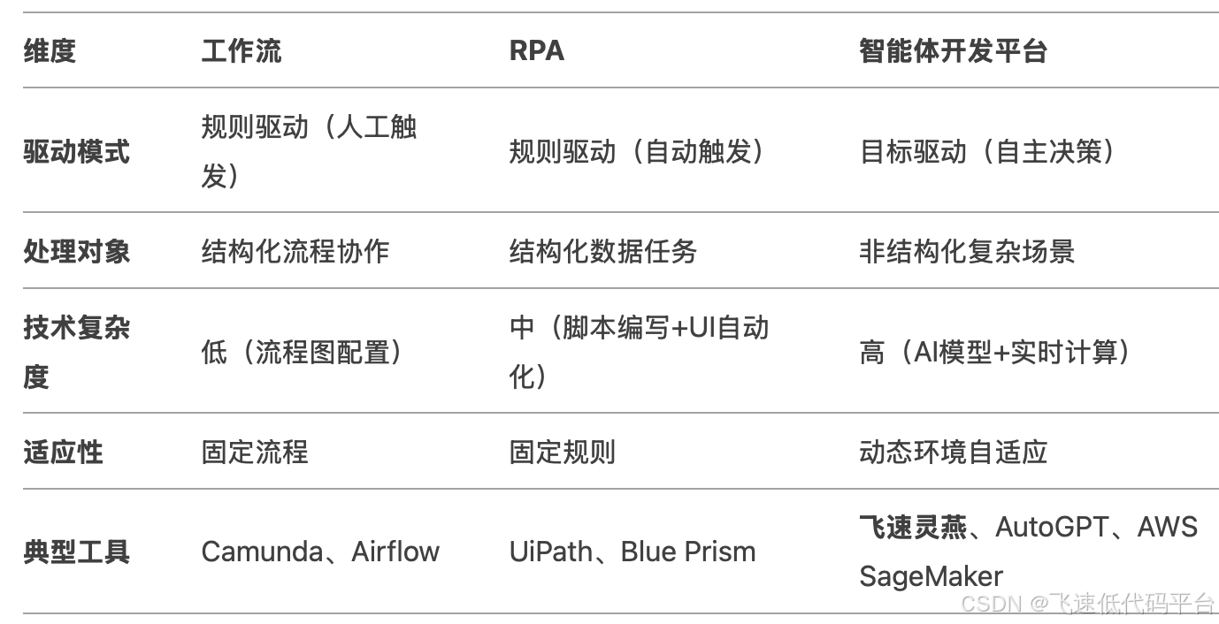 在数字化转型的浪潮中,工作流(Workflow)、RPA(机器人流程自动化)和智能体开发平台(Agent Development Platform)是三类高频出现的工具概念。定义:集成AI能力的自动化工具,支持构建具备自主决策和学习能力的智能体(Agent)。3. 智能体嵌入决策节点,处理复杂逻辑(如通过NLP解析邮件内容触发流程)。依赖底层技术栈(如API集成、规则引擎、AI模型)实现功能落地。
