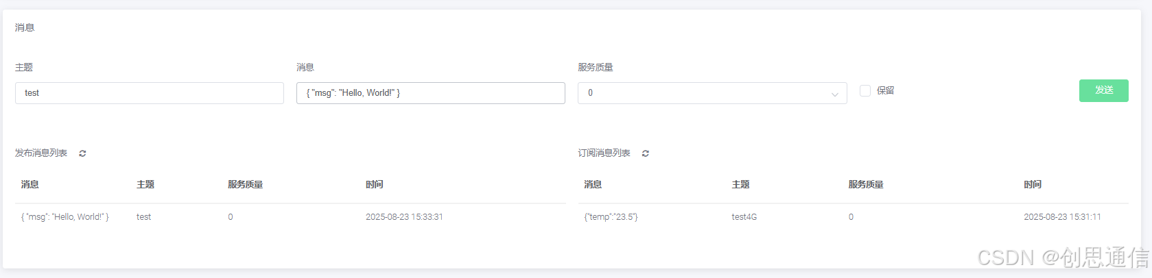 输入目标服务器的 IP 地址,填写 WebSocket 服务端口,输入需要监听的主题,完成后点击「订阅」按钮,建立主题监听。输入数据上报的目标主题,用于后续发送消息。
