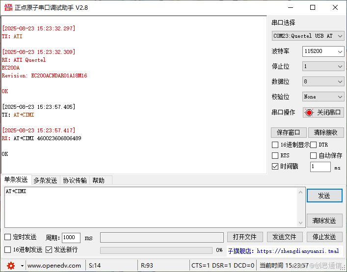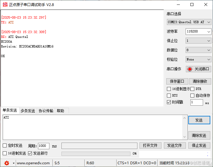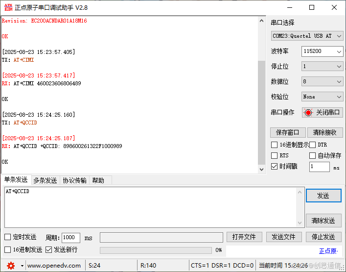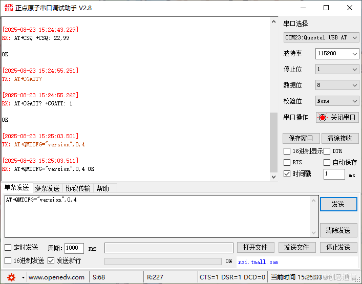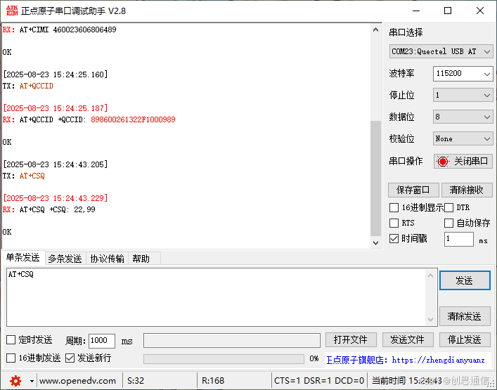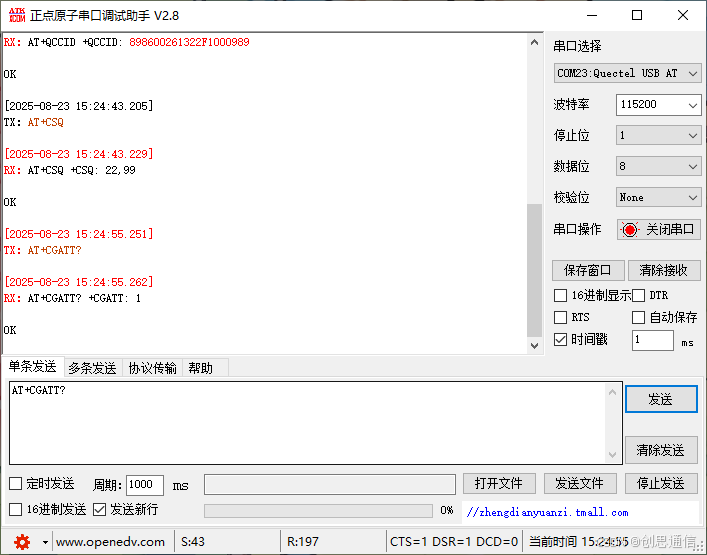 在串口调试助手中,可实时监控设备接收数据的状态: