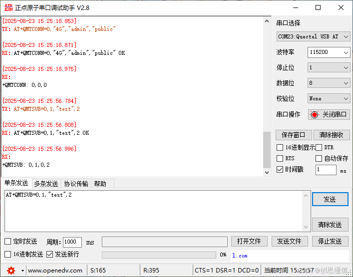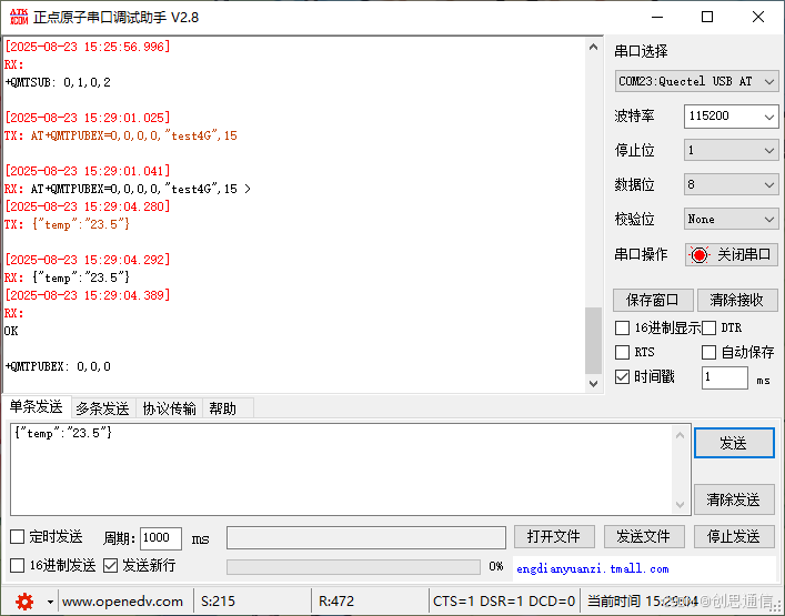 将USB转TTL模块接入设备,打开串口调试助手,选定对应通信端口,设置波特率为115200。之后通过发送AT指令,即可实现设备与EMQX平台的连接,完成数据的上传与数据下发操作。