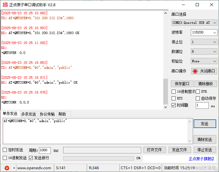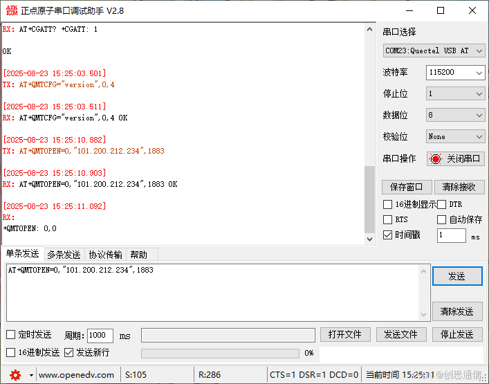发送指令:AT+QMTOPEN=0,"101.200.212.234",1883