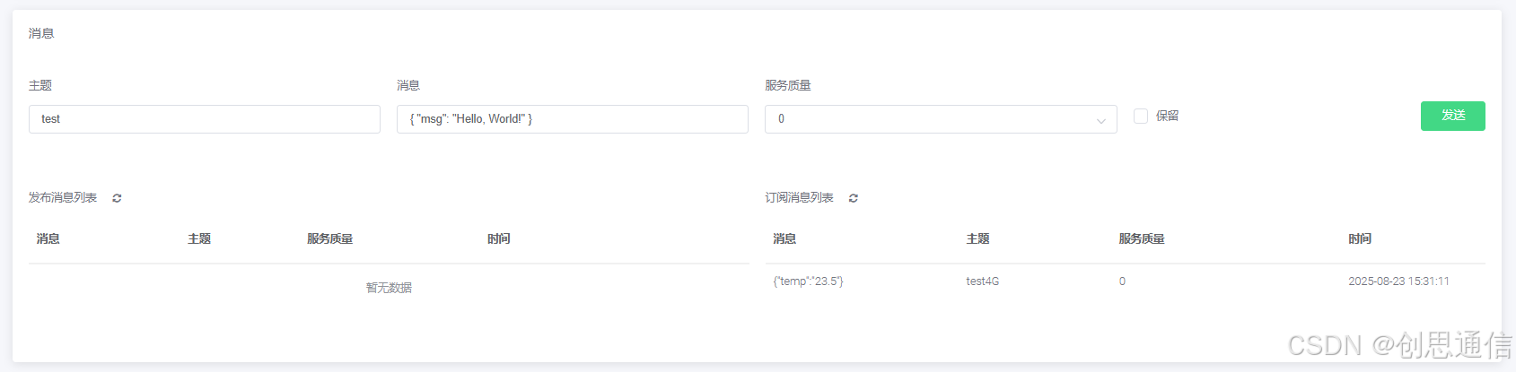 在消息输入框中,输入需要下发的指令内容,确认发布主题为设备订阅的目标主题,点击[发送]按钮,平台将通过WebSocket向设备推送指令。