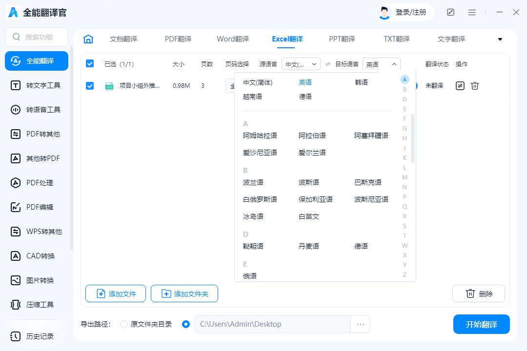 特点:专为excel设计,翻译后自动对齐单元格,数据不会错位!支持批量处理多个文件,效率翻倍。