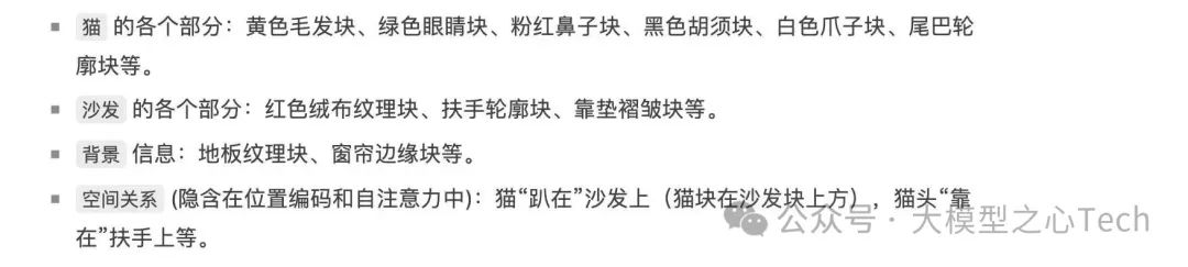 "The"),它的自注意力会关注整个输入序列(包括所有图像 Token)。为了生成"cat"这个词,模型强烈关注那些代表猫的图像 Token。为了生成"sofa",模型会关注代表沙发纹理和形状的图像 Token。同时,它也会关注文本输入中的"cat"和"image"等词,理解任务要求。 -
