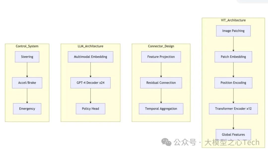 多模态系统是通过几个功能不同的算法模块协同运行的,分别负责不同层面的信息获取、统一化、融合、认知结果输出几个过程。多模态大模型的主流架构确实常采用 ViT(Vision Transformer) + Connector(适配器) + LLM(Large Language Model) 的组合模式,这种设计旨在将视觉模态与语言模态高效对齐,并利用预训练大模型的强大能力完成多模态理解和生成任务。
