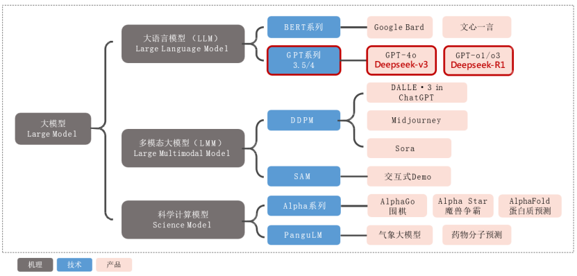 以大模型(Large Model)为核心,向下延伸出三大分支——大语言模型(LLM)、多模态大模型(LMM)和科学计算模型(Science Model)。