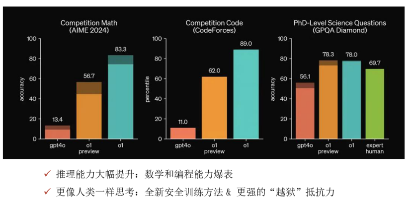 3个月后,2024年9月,GPT-o1模型发布,相比于GPT-4o,大模型的推理能力得到大幅提升,能力达到了理科博士生的水平,即使是高数题,也能迎刃而解。