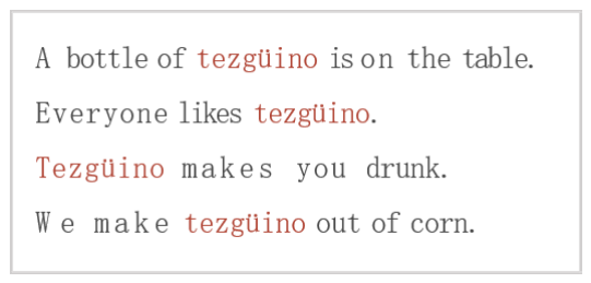 结合句子语境我们可以猜测:tezgüino是一种由玉米制作的酒精类饮料;