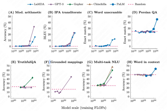 研究发现,当模型参数规模达到某个临界点时,模型会突然展现出之前不具备的能力,比如解决复杂的数学问题或进行多步骤的逻辑推理,这种现象也被称为「涌现」(Emergence)。